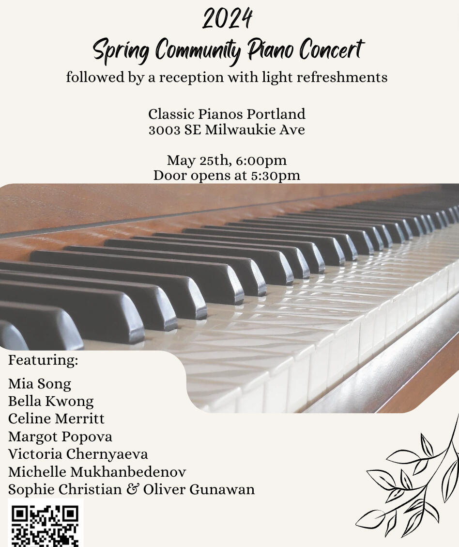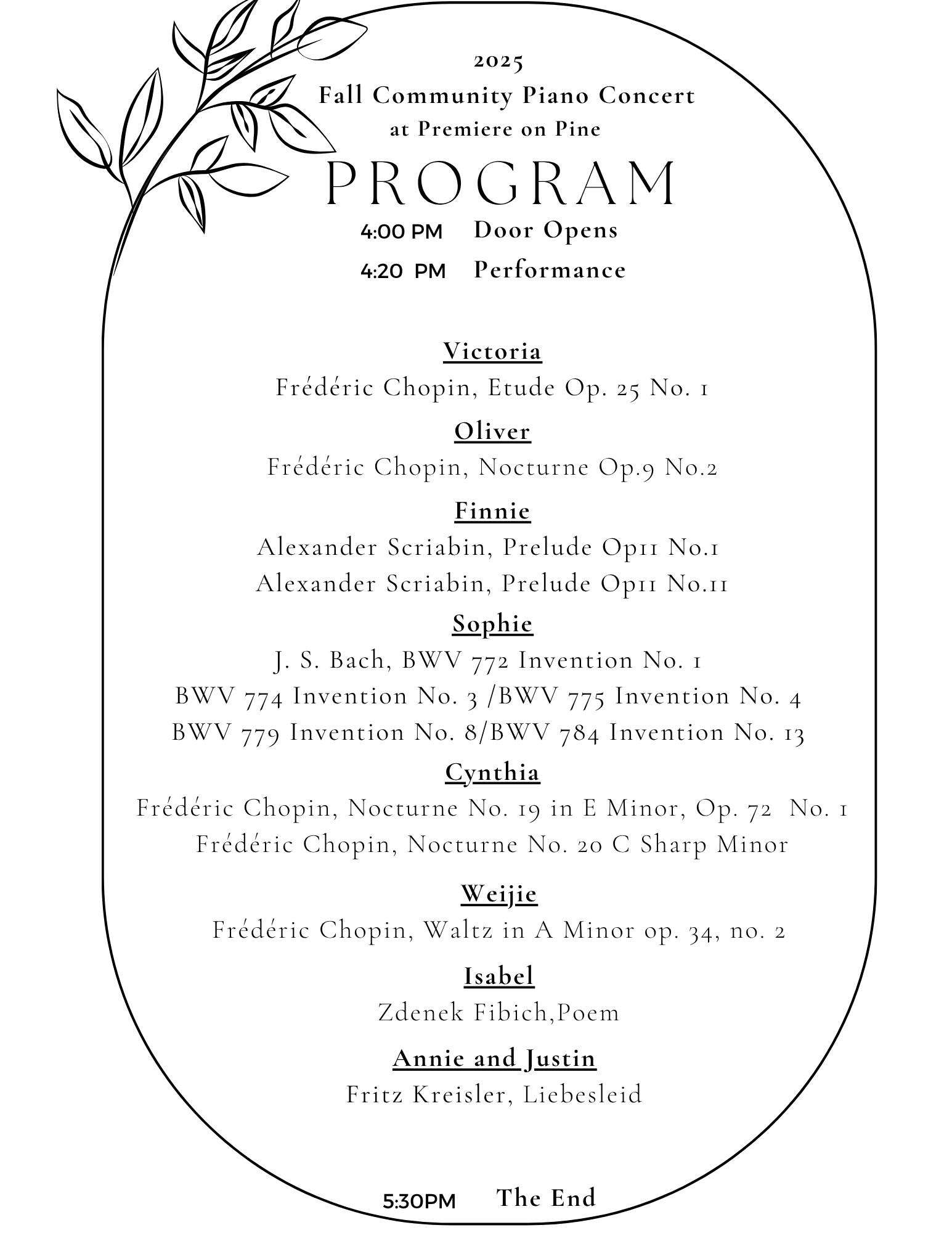 Tchaikovsky - Dance of the Sugar Plum Fairy - Lily/VictoriaTheodor Kirchner - Albumblätter, Op.7, No. 1 -DanielChopin - Nocturne in E Flat Major (Op. 9 No. 2) - MichelleMozart - Fantasy in D Minor - RosaChopin Nocturne Op 48, No1 - OscarChopin "Revolutionary" Etude, op10 #12, and "Ocean" Etude, op.25 #12-JoyceLiszt Transcendental Etude "Wilde Jagd"- Jimmy